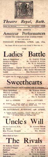 8. Theatre Royal, Bath broadside, April 15, 1879, for four plays including Gilbert's Sweethearts. Nineteen by six inches. Listed as with amateurs, by with Miss Measor, who's a professional by 1883 in item 9. $50.00 |