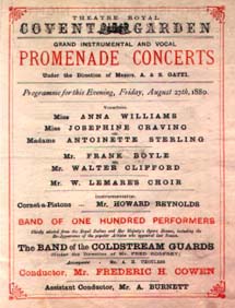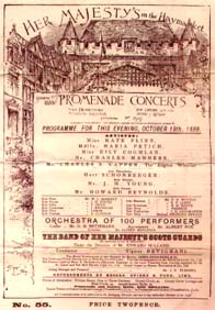 9. October 19, 1889 prom conert program featuring Arthur Sullivan's Lost Chord as a cornet solo and Quadrille from Pinafore. Four pages. Ad to last page for Grand Cellier Night when Alfred Cellier will conduct his own compositions. Twelve and a quarter by eight and a half inches. $50.00 |