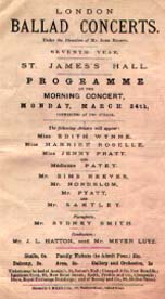 12. London Ballad Concerts program with Patey, Santley, Sims Reeves. No date. Four pages, once bound, internal tear, with Reeves doing Arthur Sullivan's Golden Days. Eight by five inches. $40.00 |