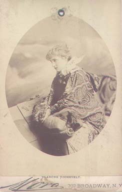 1. A rare cabinet photo by Jose Mora circa December 1879 of Blanche Roosevelt as Josephine in the first D'Oyly Carte production in America, Gilbert and Sullivan's brilliant comic light opera H M S Pinafore. Gilbert and Sullivan personally supervised the production and came over in response to numerous pirated productons and aptly, to offer the world premiere of the fully staged Pirates of Penzance. Small metal ring above oval and dusting and light dampstaining to mount not affecting image else fine. $200.00 |