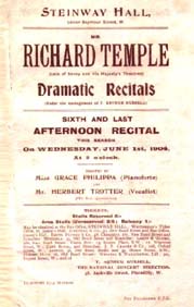 16. He was the first to play Sir Marmaduke in Sorcerer, Dick Deadeye in Pinafore, Colonel Calverly in Patence, the title role in The Mikado, and many more. A rare June 1904 Richard Temple Recital program. One page printed front and back. Dimensions nine by five and three quarters inches. Light mounting traces to left side else good. $75.00 |