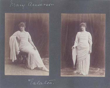 17. A wonderful pair of original albumen photographs of Mary Anderson in W. S. Gilbert's Pygmalion and Galatea circa 1884. Mounted to a black card stock Victorian album page with her name and role. Professionally matted for display to fourteen by eleven inches. Each photograph is five and a half by four inches, with albumens of William Terriss as Mercutio and one other to reverse. $125.00 |