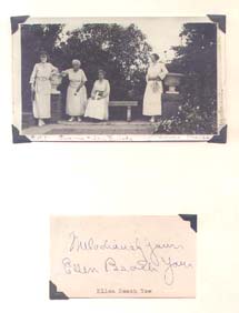 21. An extraordinary early photograph from her personal collection and autograph sentiment of the legendary soprano Ellen Beach Yaw, supposedly the only singer who could reach D above high D, who created the lead role in Arthur Sullivan's The Rose of Persia in 1899. She was a favorite of Sullivan's and the role was written for her. Photograph is six by three and haf inches with Ellen's annotations to front ("EBY, Emma and Ina Thursby, Anna Thorpe--my sister") and her note to reverse ("I thought you might like this for your collection--Emma Thursby visited me some years ago.") Small tear at bottom margin else fine. Both pieces mouted to a notebook page to eleven by eight inches. $100.00 |