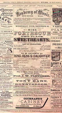 23. A large December 1886 program for W. S. Gilbert's lovely protege May Fortescue on American tour in Gilbert's Sweethearts at the Academy of Music, Buffalo. In the second play on the bill, Miss Fortescue appears as Iolanthe. She was, of course, in the original casts of Gilbert and Sullivan's Iolanthe and Patience, though in this case the play was King Rene's Daughter, popular in that era and also a vehicle for Ellen Terry and another Gilbert protege, Julia Neilson. Four pages. Dimensions fourteen by ten and a half inches. Edgewear, small tears and light soiling else good. $50.00 |