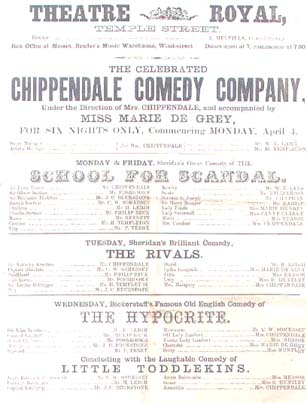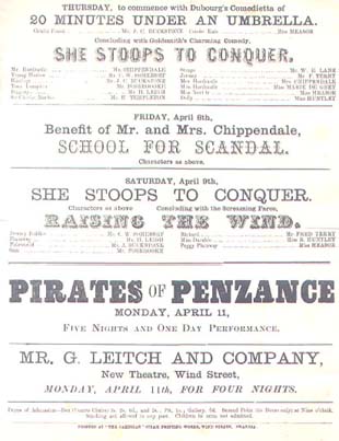 7. Theatre Royal Swansea double broadside, April 1881, for Mrs. Chippendale of the Pygmalion and Galatea original cast acting in her repertory with a bold splash ad in right panel for the touring D'Oyly Carte Pirates of Penzance, due on April 11. Seventeen by eleven and a quarter inches. Wear and small paper loss at margins else good. $75.00 |