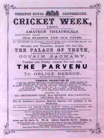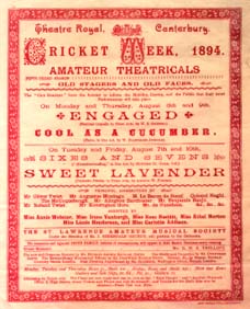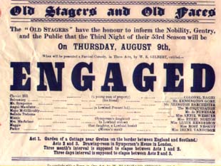 4. Broadside for W. S. Gilbert's Engaged, Theatre Royal, Canterbury, Cricket week, August 9, 1894. Twenty by eleven inches. Detail illustrated. Billed as Amateur Theatricals, Fifty Third Season, Old Stagers and Old Faces. There are a number of seasoned professionals in this, however, along with a number of people acting under pseudonyms. Irene Vanbrugh and Carlotta Addison are on the bill. Possibly professionals working with the literary and artistic set. Trollope is the stage manager. Left edge slightly irreguular and light staining at upper right corner and left edge else good. $125.00 |